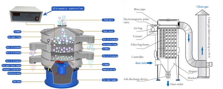 Flow-Through Ultrasonic Sieving integrates the screening function of an ultrasonic vibrating screen with the purification function of a dust collector, forming a complete material handling system. Its core structure can be divided into two main parts the main structure of the ultrasonic vibrating screen and the main structure of the dust collector.