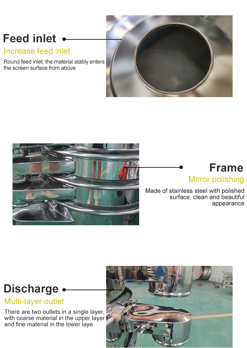 2. Rotary vibrating screen: It can be used to detect and remove foreign objects in grains, such as stones and metal fragments, which helps to prevent damage to processing equipment and ensure the safety and quality of final products, and can also sort and separate grains into different sizes It can achieve up to 5 levels of separation, and is more suitable for small-capacity screening applications. It has a smaller screen size, so the grains screened are generally fine materials.