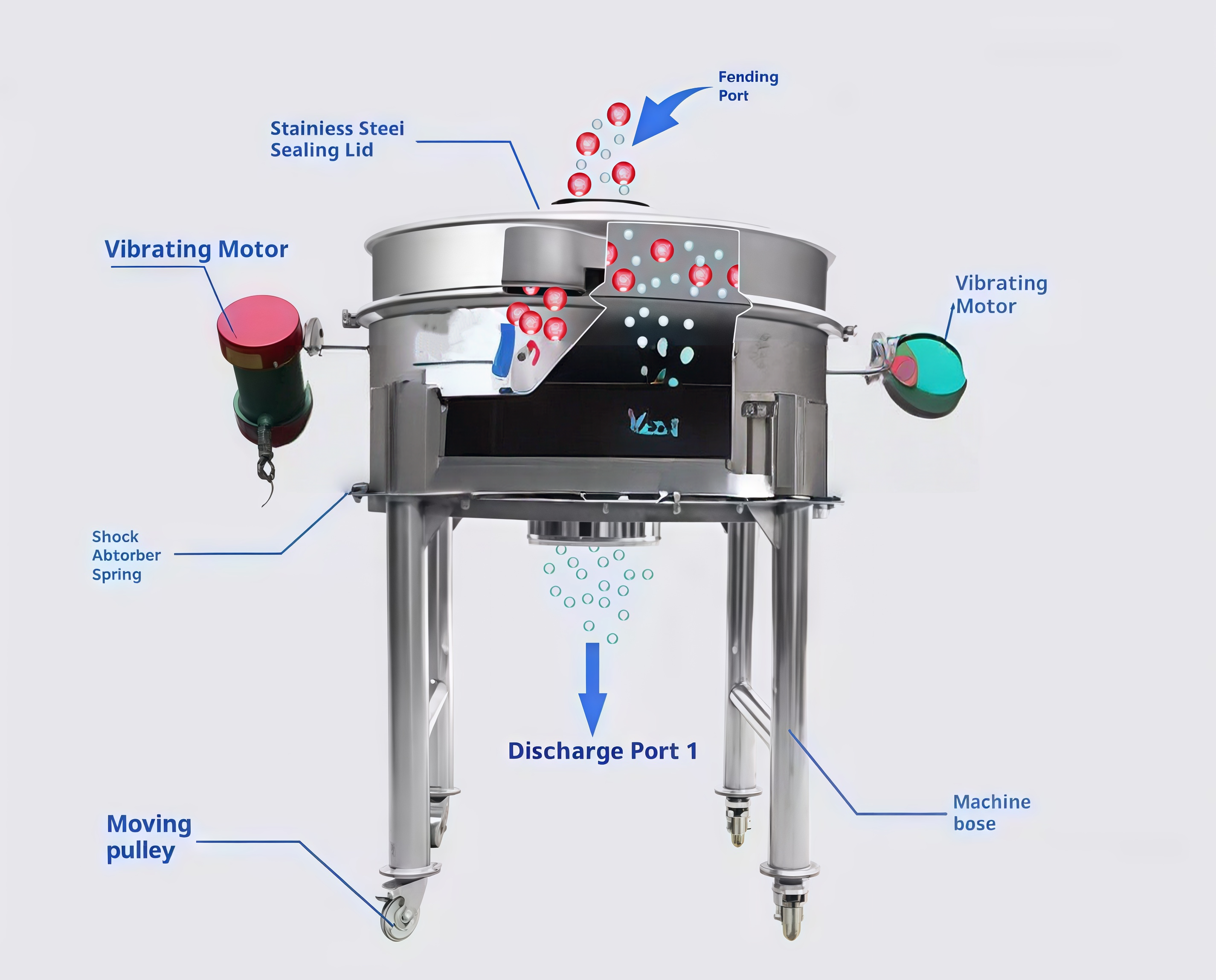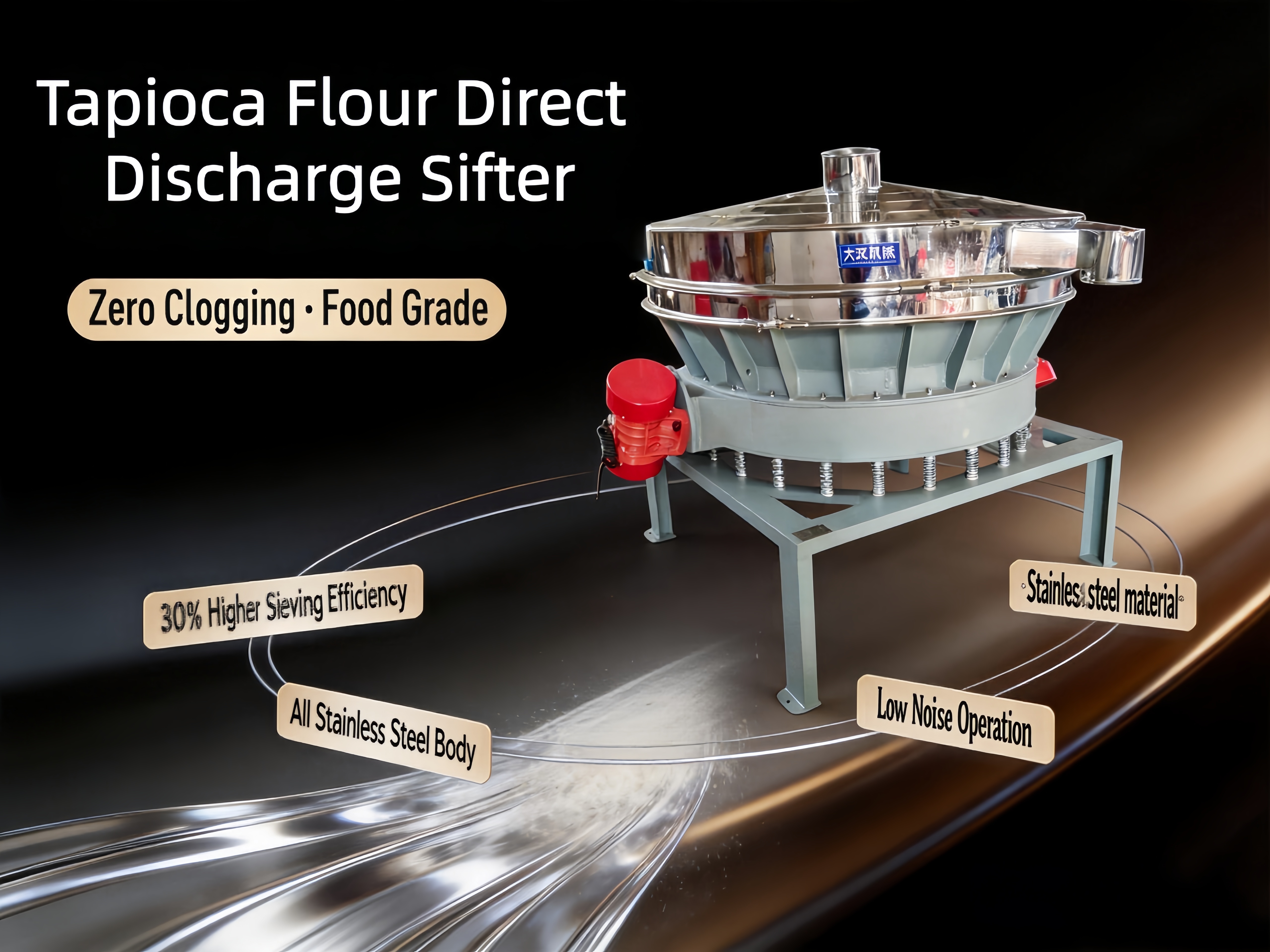 The Tapioca Flour Direct Discharge Sifter utilizes a vibration drive to generate stable vibration force, which is evenly transmitted to the entire screen surface, creating a regular vibration trajectory. Tapioca flour raw material enters the screen surface evenly through the top inlet and slowly spreads under the vibration force. Fine, qualified tapioca flour particles pass smoothly through the screen mesh and are discharged directly from the bottom outlet; while larger particles and clumps are intercepted above the screen and discharged from the side outlet due to the screen slope and vibration thrust, thus separating qualified materials from impurities.