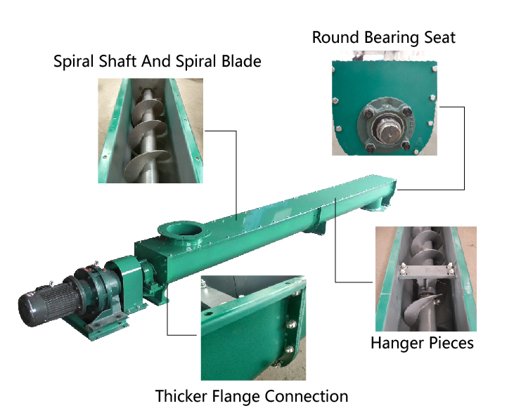 TheU Type Screw Conveyor For Cement mainly consists of core components such as the drive unit, U-shaped trough, screw shaft and blades, hanger bearing system, inlet and outlet ports, sealing device, and base.