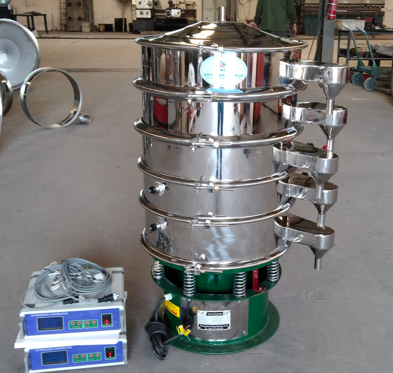 Ultrasonic Rotary Vibrating Screen: This design combines a vertical vibrating motor with an ultrasonic system. The equipment generates three-dimensional vibration through the vibrating motor, causing the material to move in a spiral motion on the screen surface. Combined with high-frequency ultrasonic cleaning, grading is achieved. The screen diameter is mostly 800-2000mm, supporting 1-6 layers of screen configurations. It can complete the separation of 2-5 particle size grades in a single pass, with a processing capacity of 0.5-10t/h.