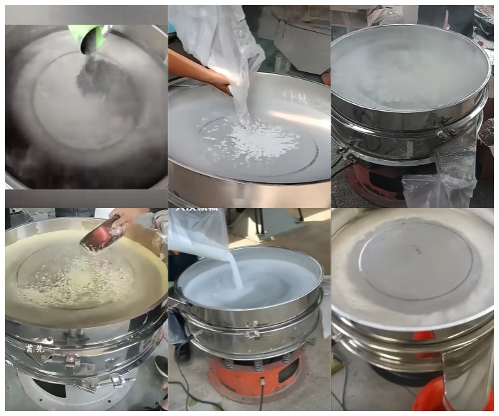Powdered materials: Includes 200-635 mesh nano-calcium carbonate, graphite powder, highly active powders, and easily static-prone powders, such as plastic granules and pigment powders, eliminating electrostatic adsorption, preventing screen sticking, and improving sieving accuracy.