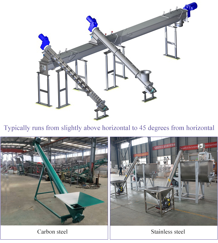 Typically runs from slightly above horizontal to 45 degrees from horizontal for conveying powder or granules from low to high