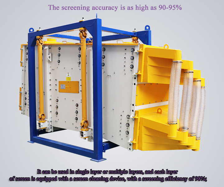 Square tumbler screen, also known as rectangular tumbler screen, reciprocating screen, adopts cyclic reciprocating motion to transmit a set of combined motion to the entire screen surface. Material screening starts at a horizontal circular motion feed end, and the circular rotation motion of the feed end is transmitted to the entire screen. The screen surface enables the material to be quickly distributed, which maximizes the utilization rate of the screen surface, with high screening efficiency and large processing capacity.